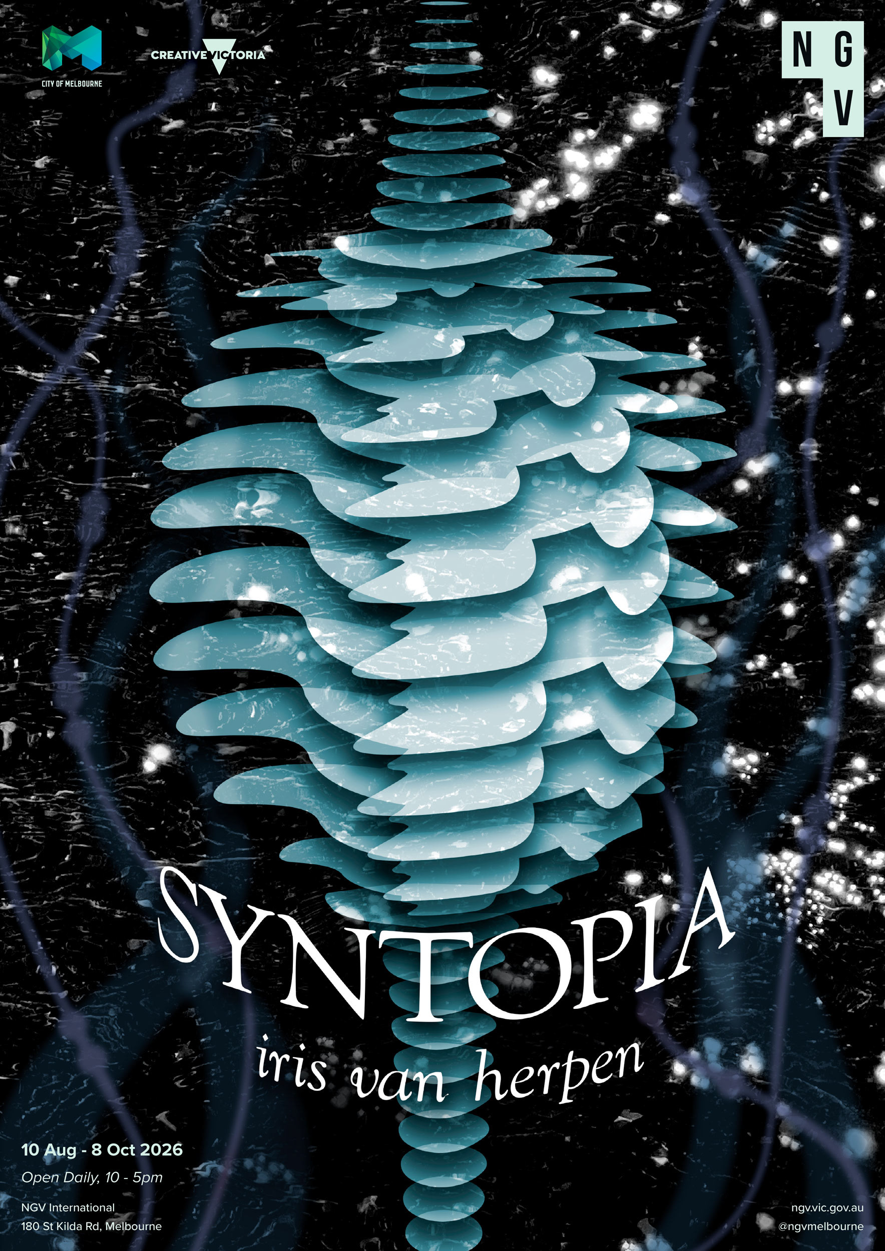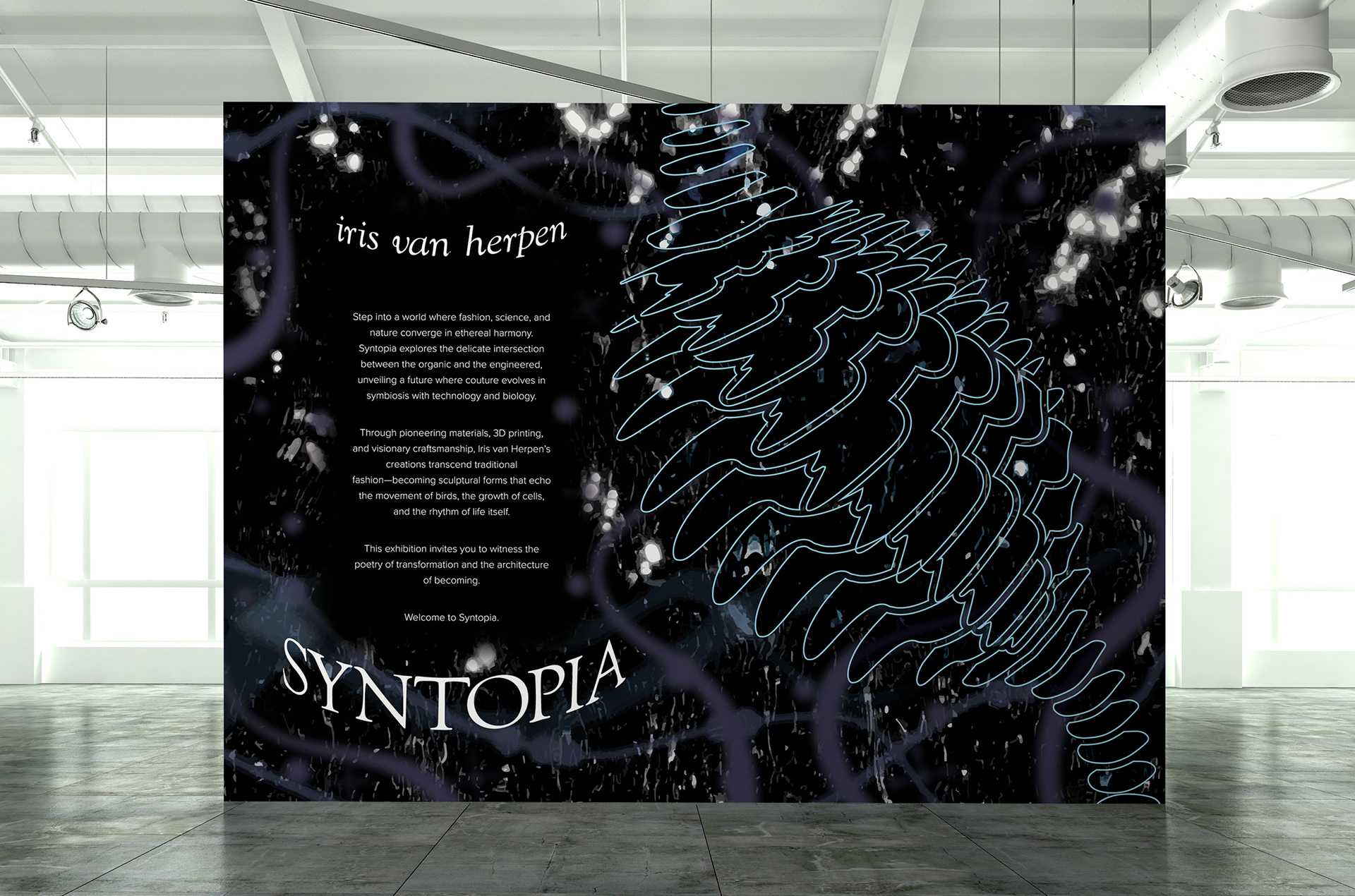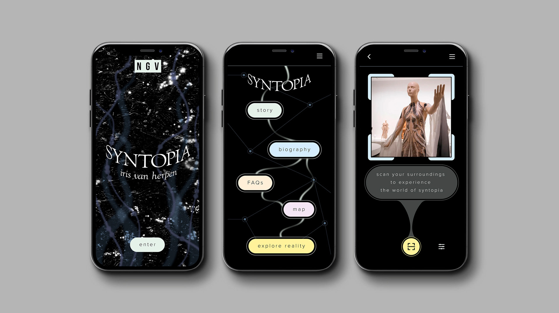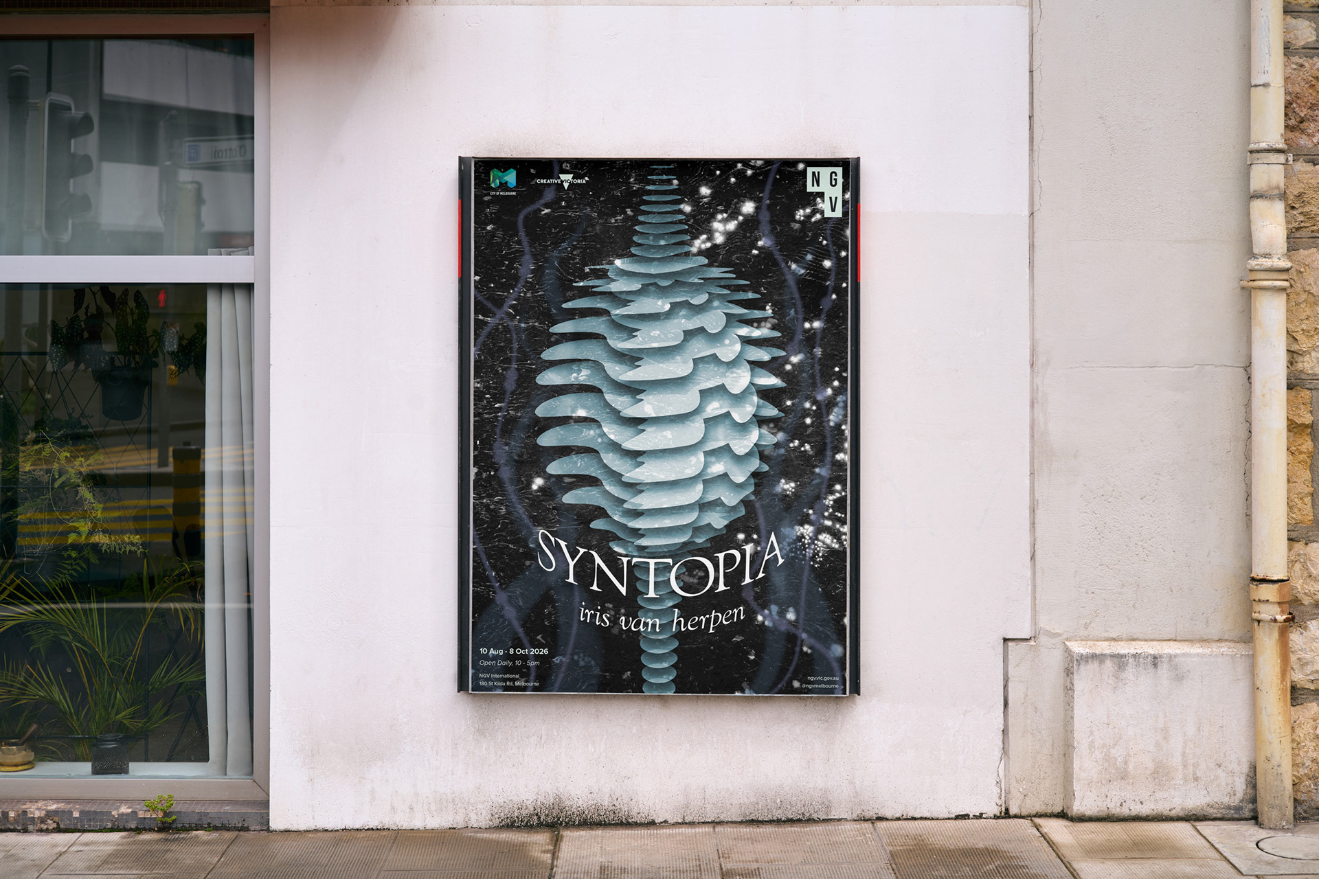 Exhibition collateral for an Iris Van Herpen inspired exhibition at NGV Melbourne. A print ad, app concept and wall decal were developed to bring this exhibition to life.